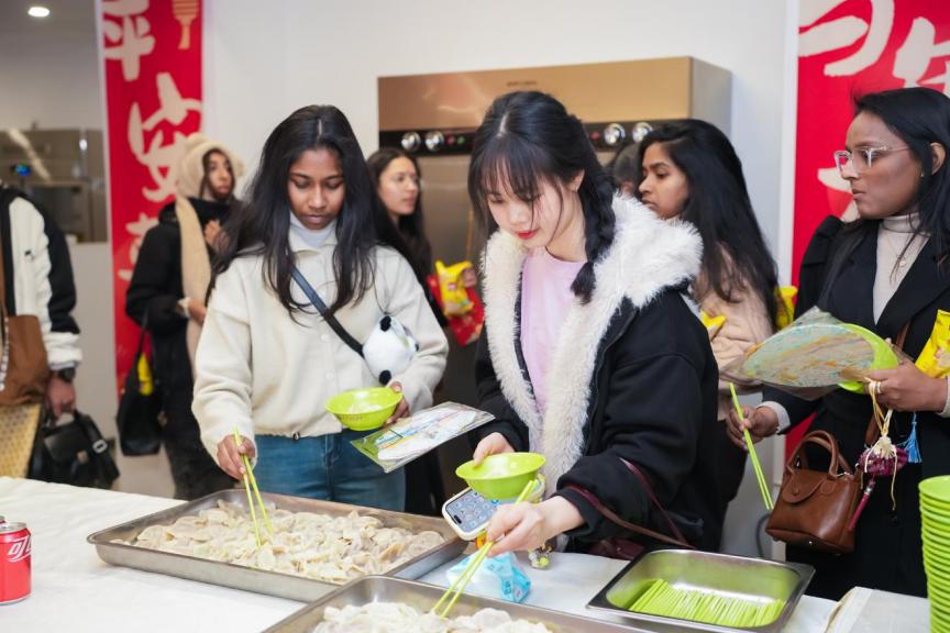 主题文化市集结合马年主题,设置了非遗体验区和文化体验区。非遗体验区特地邀请到了泥人张、杨柳青年画等非遗传承人团队为留学生们讲述生动的非遗文化故事。同时精心安排了书法体验、花钿绘制、京剧戏服体验、金石传拓、徽章制作等体验项目。活动还特别邀请了商氏面点非遗传承人商洪芳现场传授饺子制作技艺,留学生们分组体验,用指尖感受藏在春节中华传统美食中的文化底蕴,热气腾腾的饺子让他们在异乡也找到了家的温度。此次文化市集是延续天津师范大学精心打造的“万花筒”文化市集品牌的一次文化盛宴,汇聚艺术、创意、传统与现代的多元元素,搭建起多元文化交流平台,促进来自世界各地的留学生互学互鉴,感受津派文化的多彩脉动。